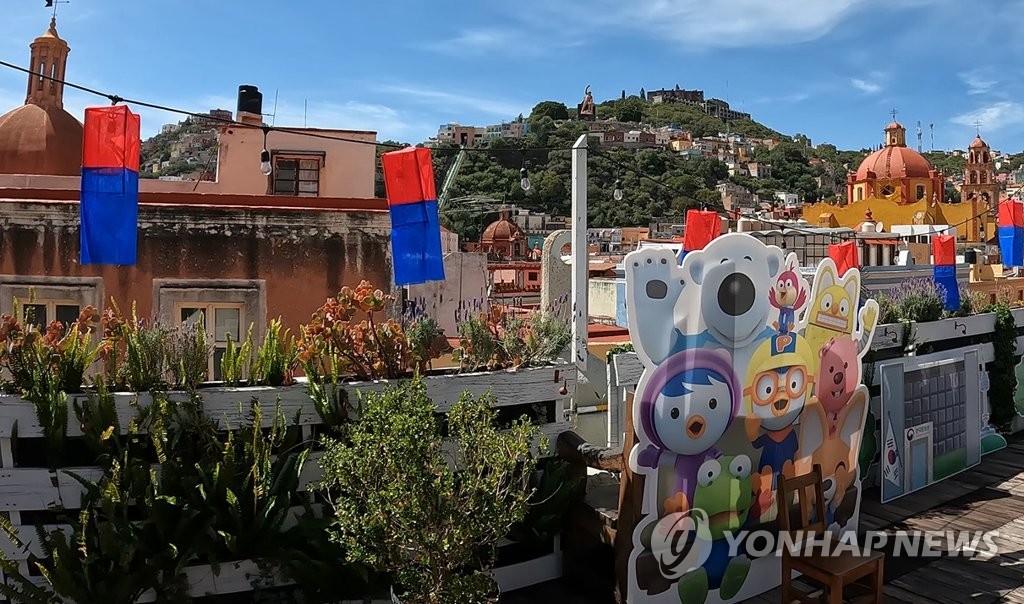 ▲ 중남미 최대 문화축제 수놓는 청사초롱과 뽀로로 (과나후아토=연합뉴스) 이재림 특파원 = 12일(현지시간) 멕시코 과나후아토에서 열린 제50회 세르반티노 축제에서 한국관 옥상에 청사초롱과 뽀로로 입간판이 마련돼 있다. 2022.10.13 walden@yna.co.kr