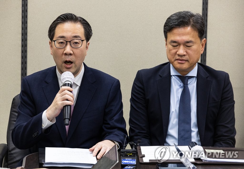 | ▲ Lee Jun-il (L), the foreign ministry's director-general for North Korean nuclear affairs, and Choi Hyun-seok, director of the Korean National Police Agency's cyber investigation bureau, give a briefing on the South Korean government's independent sanctions on Kimsuky, a hacker group under North Korea's Reconnaissance General Bureau, at the ministry in Seoul on June 2, 2023. (Yonhap) |