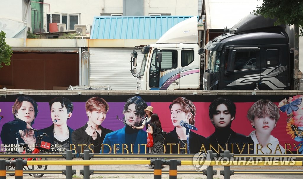 | ▲ 'BTS 데뷔 10주년 축하해' (서울=연합뉴스) 진연수 기자 = 12일 서울 용산구 하이브 사옥 인근에 그룹 방탄소년단(BTS) 데뷔 10주년을 기념하는 팬들의 응원 메시지가 붙어있다. 2023.6.12 jin90@yna.co.kr |