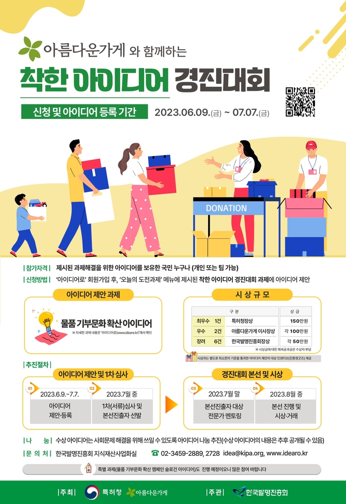 특허청 아이디어 거래 플랫폼인 '아이디어로'(www.idearo.kr)에서 진행되는 이 행사는 물품 기부문화를 확산시킬 수 있는 아이디어를 가진 국민이면 누구나 참가할 수 있다.