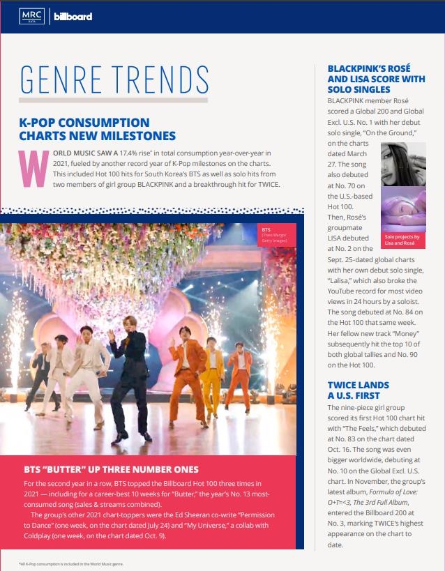 보고서는 K팝 소비가 '차트의 새로운 이정표'가 됐다고 언급하며 BTS가 지난해 '버터', '퍼미션 투 댄스', 마이 유니버스' 등 총 3곡으로 '핫 100' 차트 정상에 올랐다고 설명했다.