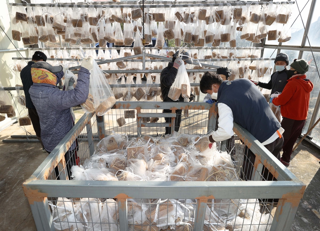 (강진=연합뉴스) 스물한 번째 절기 대설(大雪)인 7일 전통된장마을인 전남 강진군 군동면 신기마을 주민들이 발효실에서 발효를 마친 메주를 손질해 겨우내 지낼 자리로 옮기고 있다.