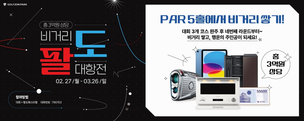 (서울=연합뉴스) 김동찬 기자 = 골프존이 3월 26일까지 전국 골프존파크 매장에서 골프존 회원들을 대상으로 총 3억원 상당 시상 규모의 '비거리 팔도대항전'을 개최한다고 28일 밝혔다.