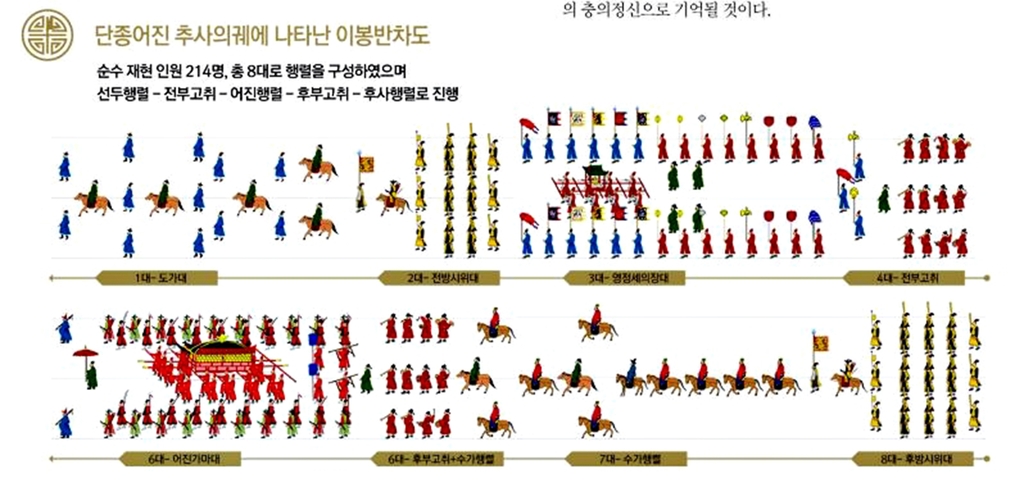 봉안 행렬은 '단종어진추사의궤'(端宗御眞追寫儀軌)의 '이봉반차도'(移奉班次圖)를 기준으로 인원 214명, 말 19필, 신연, 향정, 의장기 등을 동원해 진행한다.