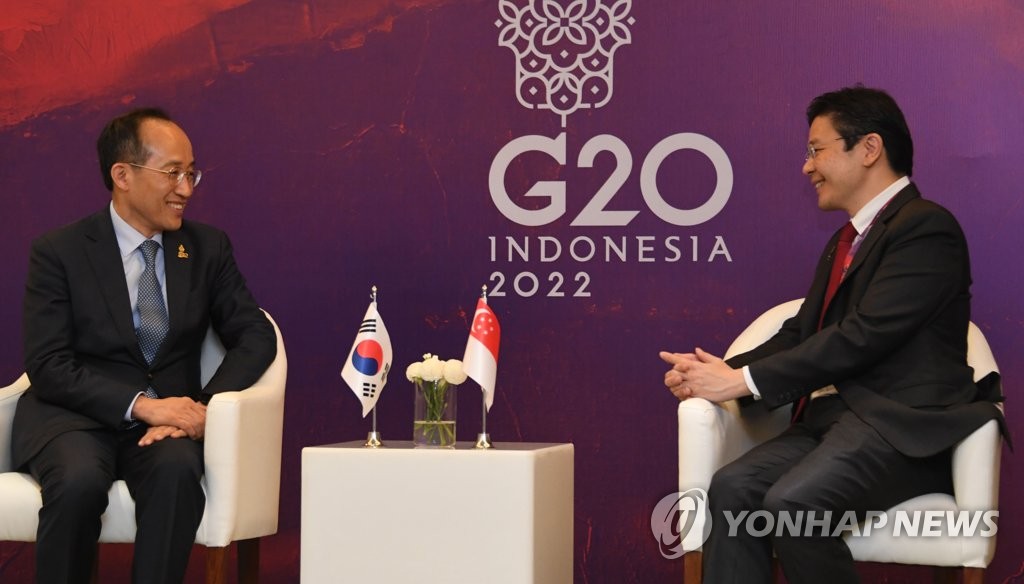 ▲ Finance Minister Choo Kyung-ho (L) holds talks with his Singaporean counterpart, Lawrence Wong, on the sidelines of a meeting of Group of 20 finance ministers and central bank chiefs in Bali, Indonesia, on July 15, 2022, in this photo provided by the ministry. (PHOTO NOT FOR SALE) (Yonhap) |