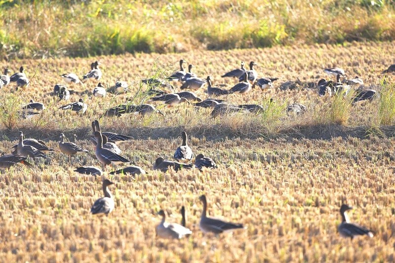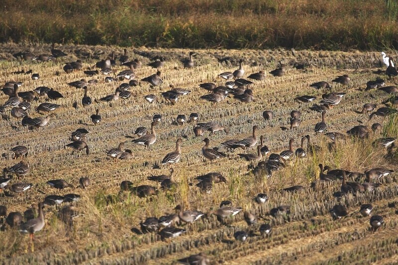 멸종위기야생생물 II급 큰기러기와 쇠기러기가 주를 이루고 있고, 수확이 끝난 농경지에서 먹이활동을 하고 있다.