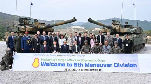 | ▲ This file photo, provided by Seoul's foreign ministry on May 10, 2023, shows foreign envoys to South Korea from 18 countries attending an arms promotion event in Pocheon, 52 kilometers northeast of Seoul, on May 2. (PHOTO NOT FOR SALE) (Yonhap) |
