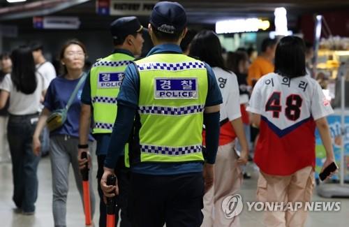 | ▲ Police officers patrol inside a baseball park in the southwestern city of Gwangju on Aug. 8, 2023, following an online murder threat there. (Yonhap) |
