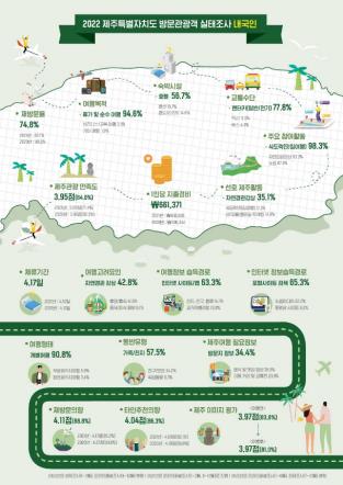 제주관광공사는 20일 2021년 한 해 동안 제주를 방문한 관광객의 여행 행태와 소비실태, 제주 여행에 대한 평가 등을 조사한 '2022년 제주특별자치도 방문관광객 실태조사'를 발표했다.