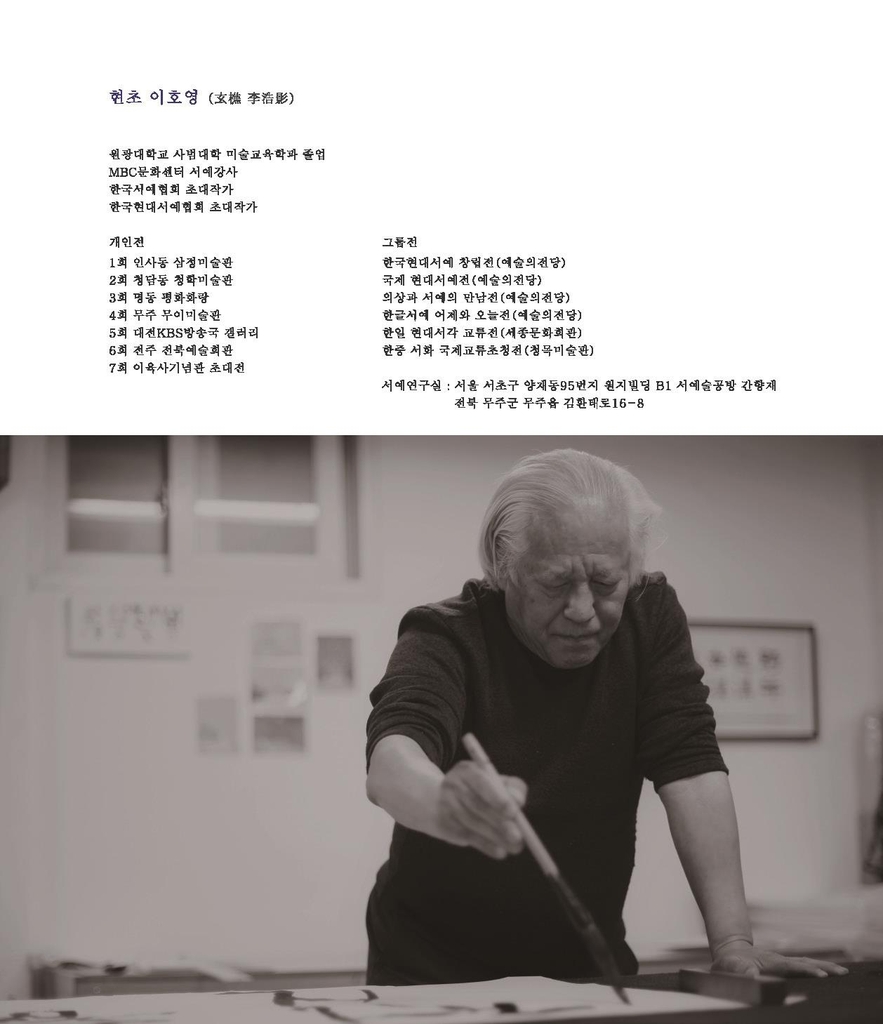 (무주=연합뉴스) 최영수 기자 = 한국서예협회 초대작가를 지낸 이호영 서예가의 작품 70여점을 만날 수 있는 전시회가 오는 30일까지 전북 무주군 안성면 무주예술창작스튜디오에서 열린다.