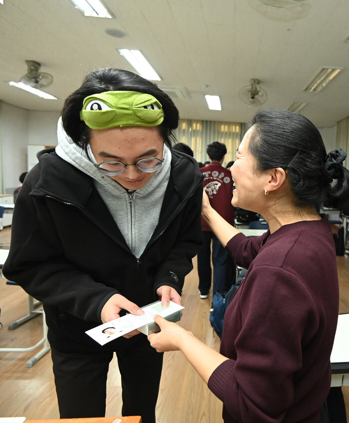 A high school senior receives a test identification slip from his homeroom teacher at Choongang High School in Seoul on Nov. 12, 2025, one day ahead of the state-administrated scholastic aptitude test, a key deciding factor in college entrance that will be administered across the country. Some 554,000 students nationwide are taking the test to enter college in the spring semester that begins in March. (Pool photo) (Yonhap)