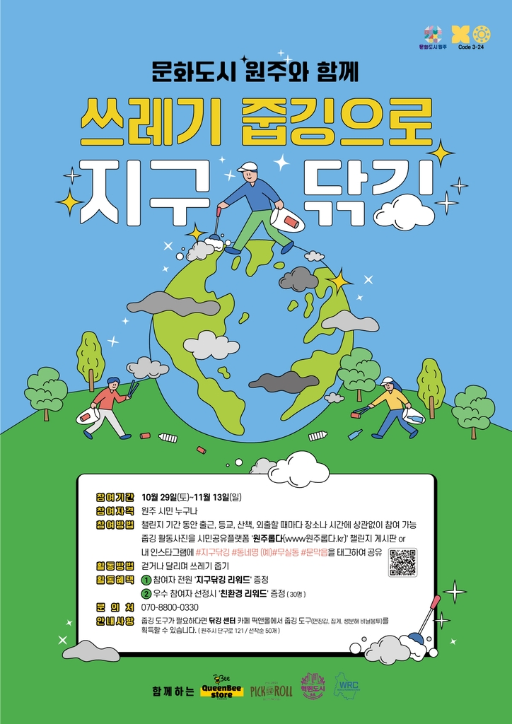 (원주=연합뉴스) 이재현 기자 = 원주시 창의문화도시지원센터는 29일부터 11월 13일까지 시민과 함께하는 챌린지 캠페인 '쓰레기 줍깅으로 지구닦깅'을 진행한다고 26일 밝혔다.