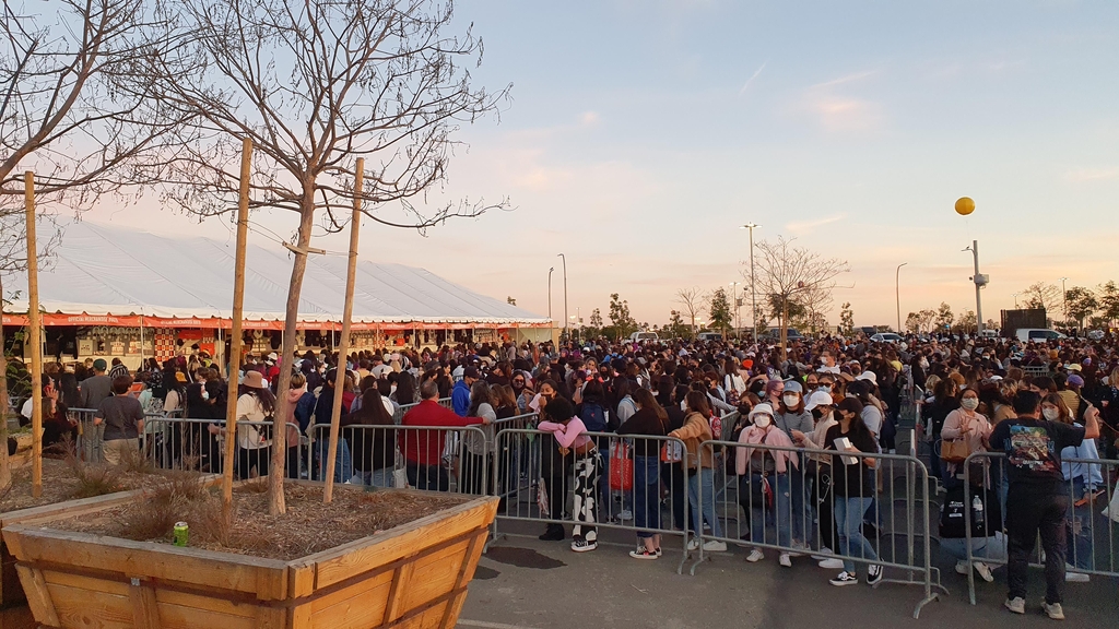 (로스앤젤레스=연합뉴스) 이태수 기자 = 그룹 방탄소년단의 콘서트를 하루 앞둔 26일(현지시간) 미국 로스앤젤레스 소파이 스타디움 인근은 '축제'를 미리 즐기러 온 수천 명의 인파로 낮부터 북적였다.