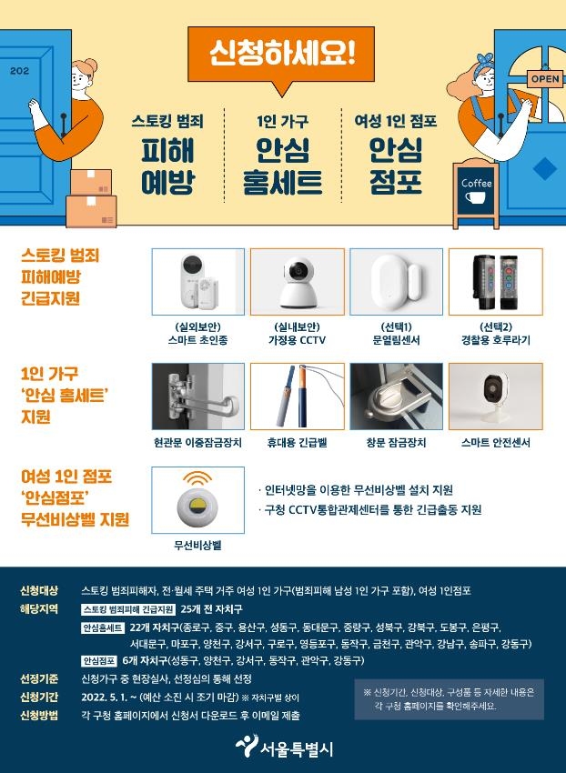 시는 여성 1인가구와 1인점포에 대한 안심장비 지원도 이어간다. 주거침입 피해를 경험한 남성 1인가구도 지원대상에 포함했다. 1인 가구에는 최근 급등한 전월세가를 반영해 자치구별 임차보증금 기준을 완화해 안심장비를 지원할 예정이다.