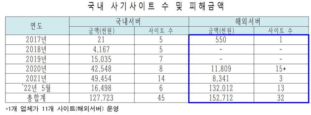 | ▲ 국내 사기 사이트 적발 현황(2017년∼2022년 5월) [서울시 제공. 재판매 및 DB 금지] |