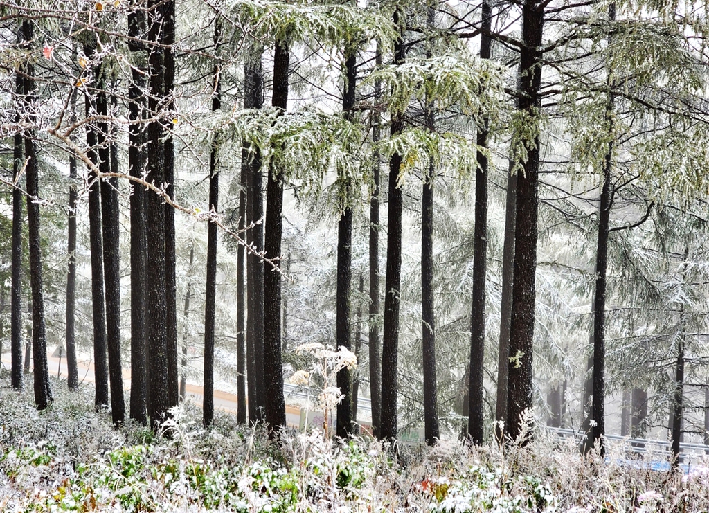 상록수에 사뿐히 내려앉은 얼음꽃과 오색단풍은 가을과 겨울의 경계선을 만들었다.