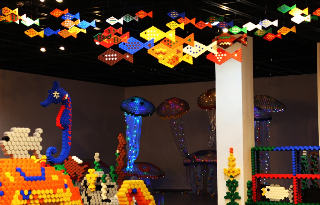 작품을 제작한 김계현 작가는 10만개 이상의 블록을 사용해 1천157㎡ 규모의 전시장을 대형 블록 작품들로 가득 채웠다.