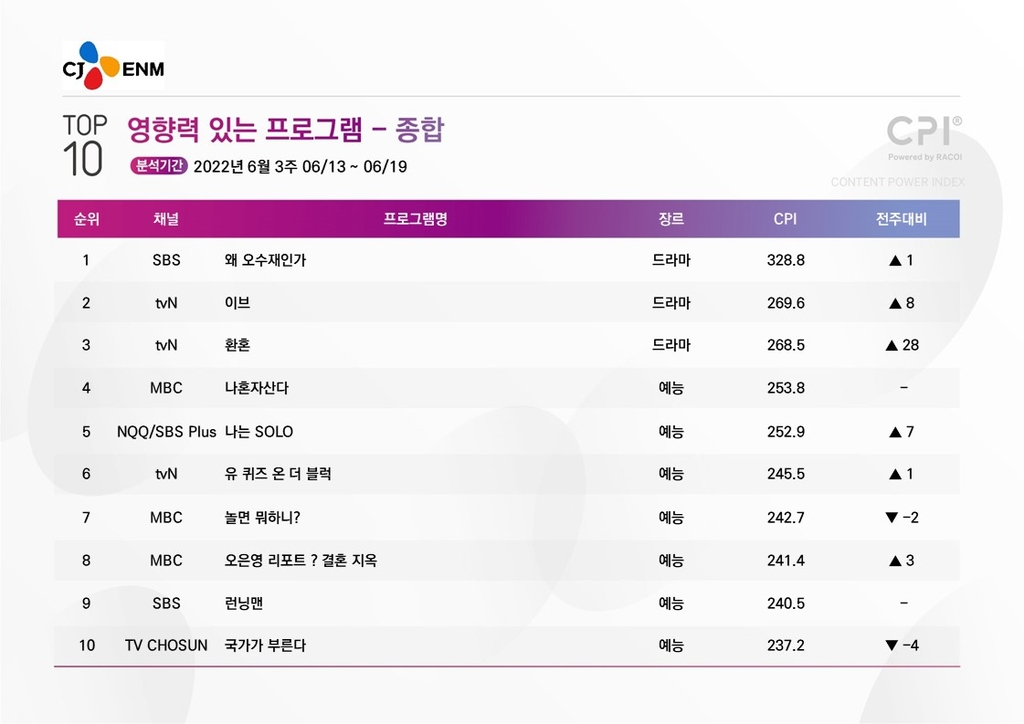 ☞ CPI 지수 = 지상파, 종합편성채널, 케이블 등 29개 채널 프라임 시간대 방송 드라마, 연예·오락, 음악, 인포테인먼트 프로그램을 대상으로 시청자 행동을 파악하는 지표. 방송통신위원회 방송콘텐츠가치정보분석시스템(RACOI)을 통해 주간 단위로 프로그램 관련 시청자 데이터(동영상 조회수, 게시글수, 댓글수)를 수집해 200점 기준 표준점수로 환산해 평균을 산출한다.
