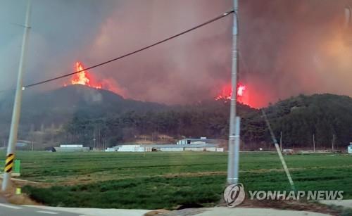 The wildfires in the county of Hongseong, 114 kilometers south of Seoul, and the nearby cities of Dangjin and Daejeon broke out on Sunday when a dry weather warning was issued in the region, and remain unextinguished as of Tuesday morning.