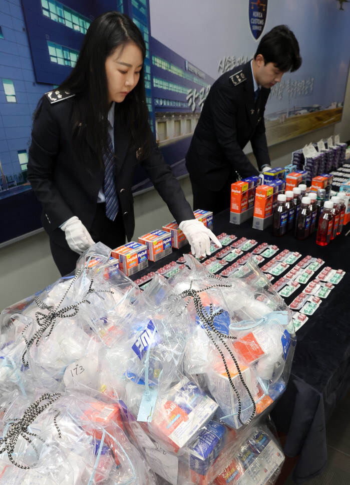 Customs officials display imported medicine containing narcotic elements at the customs office in Incheon, west of Seoul, on March 18, 2025. (Pool photo) (Yonhap)