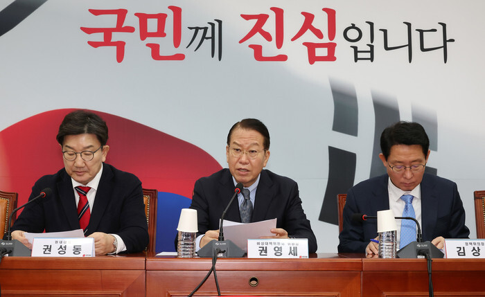 Kwon Young-se (C), chief of the ruling People Power Party's emergency leadership committee, speaks during a meeting of the committee at the National Assembly in Seoul on Feb. 13, 2025. (Yonhap)