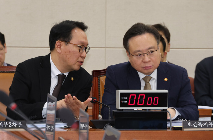 Health Minister Cho Kyoo-hong (R) talks with Second Vice Health Minister Park Min-soo during a plenary session of the health and welfare committee at the National Assembly in Seoul on Feb. 21, 2025. (Yonhap)