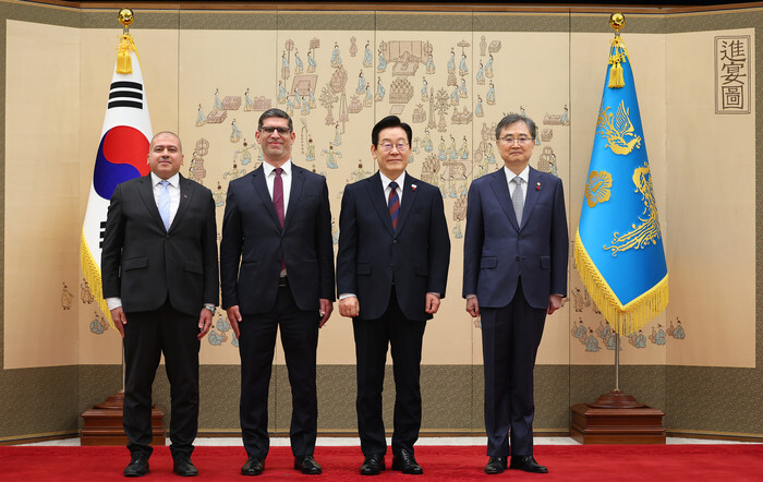 President Lee Jae Myung (2nd from R), accompanied by Foreign Minister Cho Hyun (R), poses with Egyptian Ambassador to South Korea Hazem Zaki (2nd from L) after receiving the new envoy's diplomatic credentials during a ceremony at the presidential office in Seoul on Dec. 11, 2025. (Yonhap)