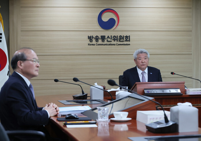 Kim Hong-il (R), head of the Korea Communications Commission, holds a meeting at the commission in Gwacheon, south of Seoul, on June 28, 2024, amid opposition parties' move to introduce an impeachment bill against him over the commission's plan to appoint the executives of public broadcasters, including KBS and MBC. (Yonhap)
