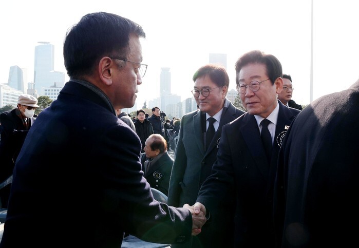 Acting President Choi Sang-mok (L) shakes hands with Lee Jae-myung, leader of the main opposition Democratic Party, during a memorial service for late former National Assembly Speaker Kim Soo-han at the parliamentary building in Seoul on Jan. 3, 2025. Kim, who served as the parliamentary leader from 1996 to 1998, died at the age of 96 on Dec. 30, 2024. (Pool photo) (Yonhap)