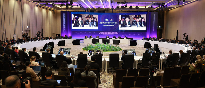 South Korean Finance Minister Koo Yun-cheol presides over the opening session of the 2025 APEC Finance Ministers' Meeting and Structural Reform Ministerial Meeting at the Inspire Resort in Incheon, west of Seoul, on Oct. 21, 2025. (Yonhap)