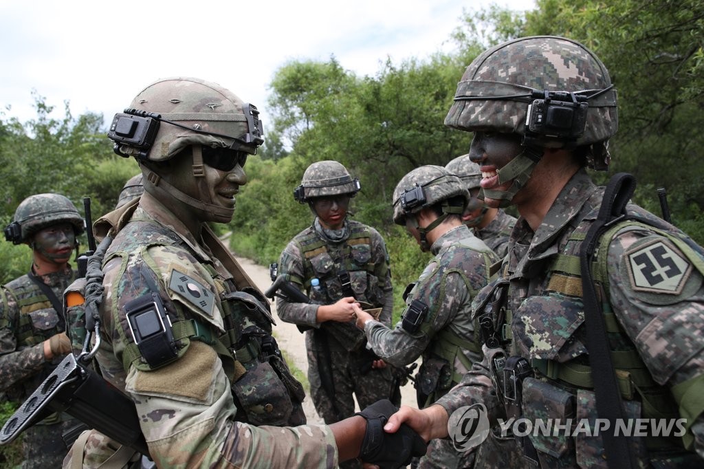 | ▲ This file photo, provided by the Defense Daily on Aug. 24, 2022, shows South Korean and U.S. troops shaking hands as they take part in combined drills in the eastern county of Inje, 126 kilometers northeast of Seoul. (PHOTO NOT FOR SALE) (Yonhap) |