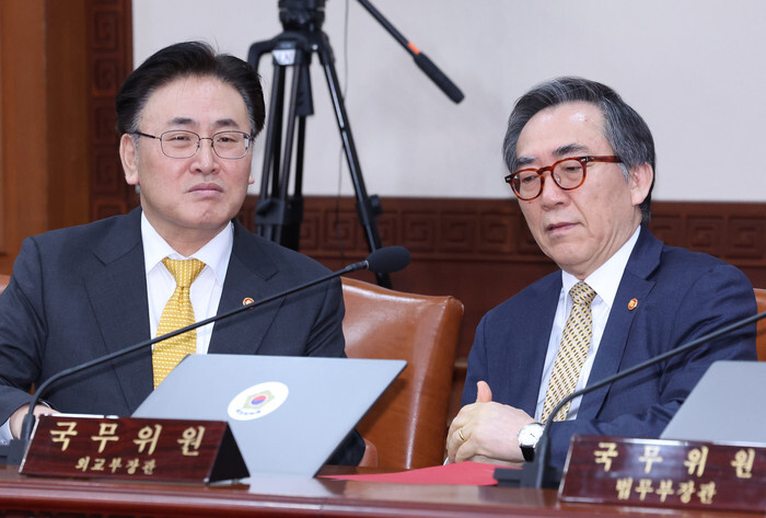 Foreign Minister Cho Tae-yul (R) talks with Science and ICT Minister Yoo Sang-im as they attend a Cabinet meeting at the government complex in Seoul on March 18, 2025. (Pool photo) (Yonhap)