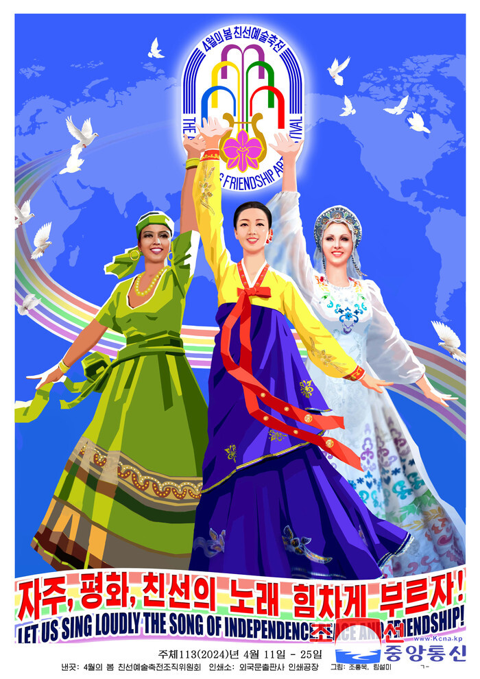 This photo, released by North Korea's official Korean Central News Agency on April 2, 2024, shows one of the propaganda posters issued to promote the country's 33rd April Spring Friendship Art Festival set for April 11-25 in Pyongyang. (For Use Only in the Republic of Korea. No Redistribution) (Yonhap)