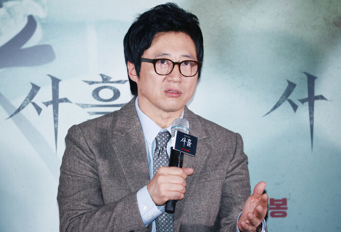 South Korean actor Park Shin-yang, who stars in the new movie "Devils Stay," responds to reporters' questions during an event in Seoul on Nov. 12, 2024, to promote the movie, set to hit local screens in South Korea on Nov. 14. (Yonhap)