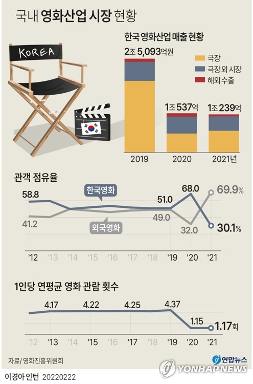| ▲ [그래픽] 국내 영화산업 현황 (서울=연합뉴스) 장예진 기자 = 22일 영화진흥위원회가 발표한 '2021년 한국 영화산업 결산' 자료에 따르면 지난해 국내 영화산업 시장 규모는 1조239억원으로 2년째 감소세를 보였다. 2조5천93억원 규모였던 2019년과 비교하면 40.8% 수준으로 축소됐다. jin34@yna.co.kr 페이스북 tuney.kr/LeYN1 트위터 @yonhap_graphics |