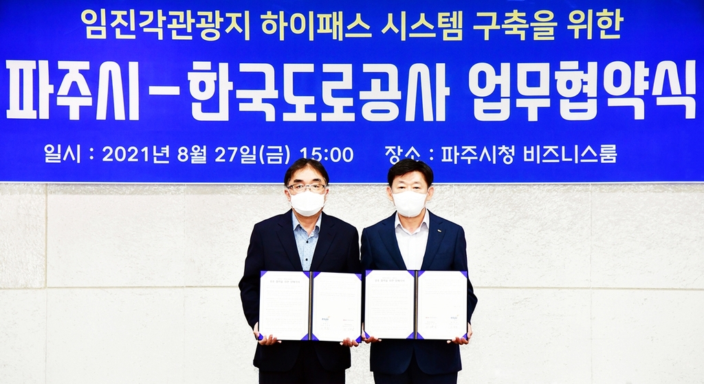 (파주=연합뉴스) 노승혁 기자 = 경기 파주시는 한국도로공사와 '임진각 관광지 하이패스 시스템 구축'을 위한 업무협약을 체결했다고 30일 밝혔다.