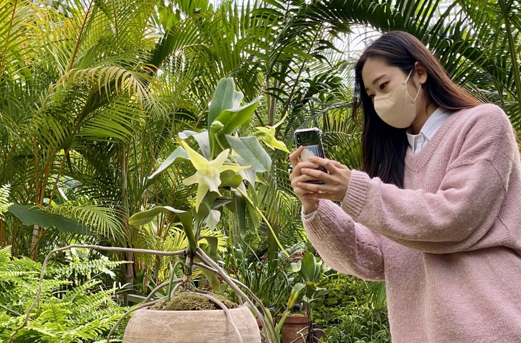 | ▲ 국립세종수목원서 다윈난 꽃 활짝 (세종=연합뉴스) 12일 국립세종수목원 사계절전시온실 내 열대온실을 찾은 한 탐방색이 활짝 핀 다윈난 꽃을 카메라에 담고 있다. 2022.1.12 [국립세종수목원 제공. 재판매 및 DB 금지] |