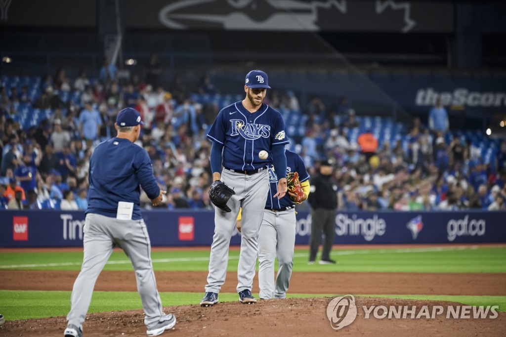 | ▲ 탬파베이 콜린 포셰, 강판 (토론토 AP=연합뉴스) 탬파베이 불펜 투수 콜린 포셰가 15일(한국시간) 캐나다 온타리오주 토론토의 로저스센터에서 열린 토론토와의 2023 미국프로야구 메이저리그 방문 경기에서, 강판당하고 있다. |