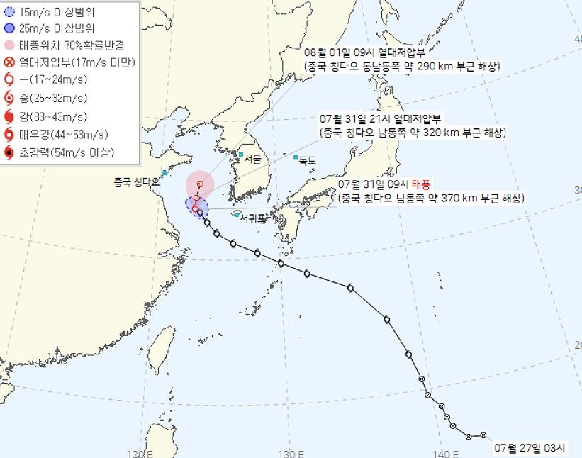 위치는 중국 칭다오 남동쪽 370㎞ 부근 해상이며, 이 태풍은 이날 오후부터 내달 1일 새벽 사이 열대저압부로 약화할 것으로 예상된다.