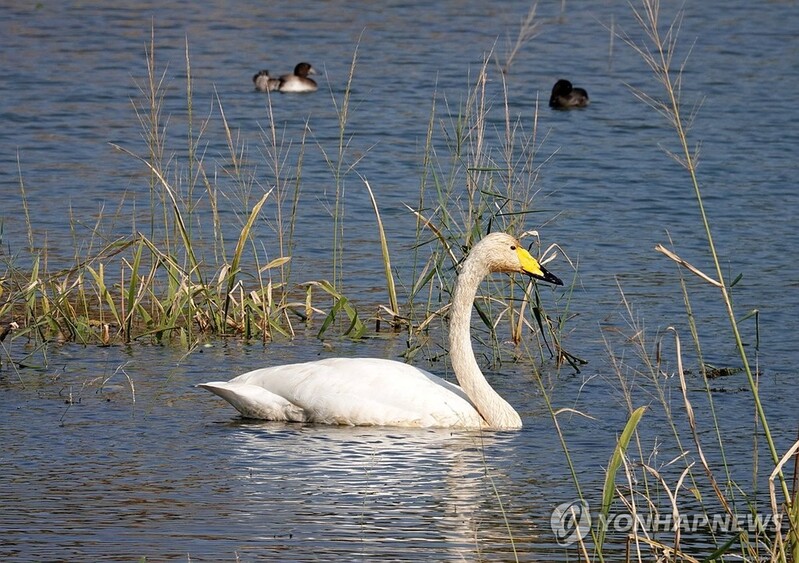 ▲ 선발대로 온 겨울 진객 큰고니 (강릉=연합뉴스) 2일 강원 강릉시 경포천에 선발대로 온 겨울 철새인 천연기념물 큰고니가 먹이활동을 하고 있다. 2023.11.2 [독자 제공. 재판매 및 DB 금지] photo@yna.co.kr