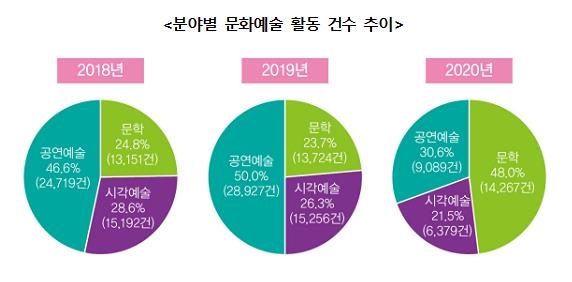 2020년 한 해 동안 이뤄진 전체 예술 활동 가운데 문학의 비중이 48.0%로 가장 높았고, 공연예술(30.6%), 시각예술(21.5%) 순이었다.