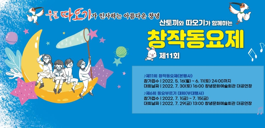 (창녕=연합뉴스) 경남 창녕군은 제11회 산토끼, 따오기가 함께 함께하는 창작동요제를 오는 30일 창녕문화예술회관에서 연다고 27일 밝혔다.