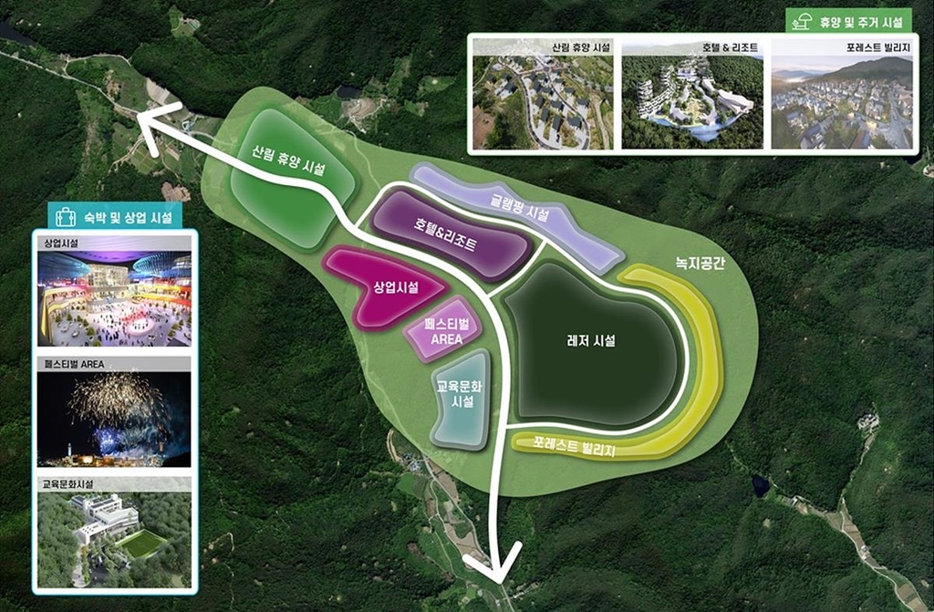 복합휴양 관광단지에는 골프장 등 레저시설과 호텔, 고급 타운하우스, 산림휴양시설 등이 조성된다.