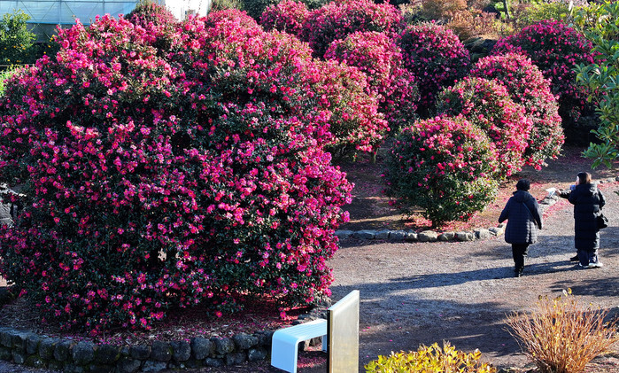 Visitors walk along a path lined with camellia flowers in full bloom at a park in the city of Seogwipo on South Korea's southern resort island of Jeju on Jan. 2, 2025. (Yonhap)