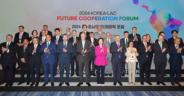 SMEs and Startups Minister Oh Young-ju (6th from R, front row) poses for a photo with other participants, including Peruvian Foreign Minister Javier Gonzalez-Olaechea (6th from L, front row) during the 2024 Korea-LAC future cooperation forum at a hotel in Seoul on June 10, 2024. LAC is short for Latin America and the Caribbean. (Yonhap)