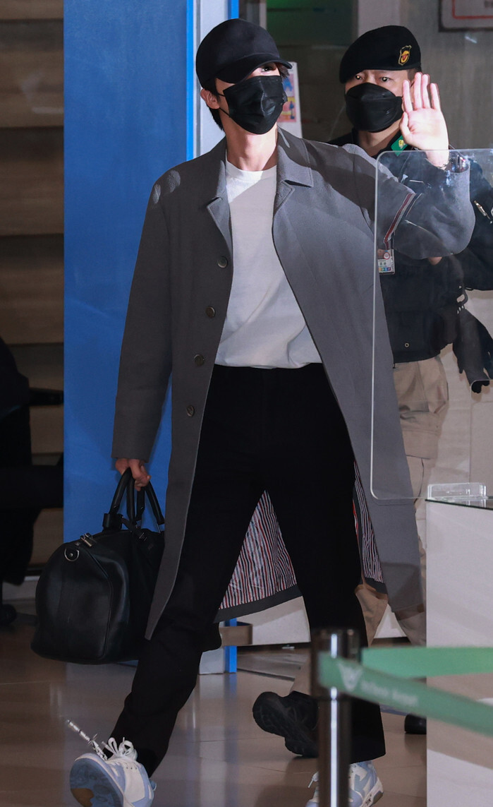 Jin, a member of South Korean boy group BTS, waves toward fans upon arrival at Incheon International Airport, west of Seoul, on Dec. 6, 2021, from a trip to the United States for the septet's concerts at SoFi Stadium in Los Angeles. (Yonhap)
