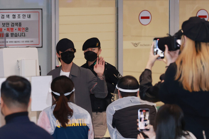 Jin, a member of South Korean boy group BTS, waves toward fans upon arrival at Incheon International Airport, west of Seoul, on Dec. 6, 2021, from a trip to the United States for the septet's concerts at SoFi Stadium in Los Angeles. (Yonhap)
