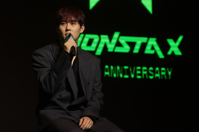 Joohoney, a member of South Korean boy group Monsta X, speaks during a publicity event in Seoul on July 16, 2025, to mark the group's 10th anniversary of its debut. (Yonhap)