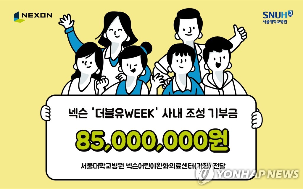 ▲ 넥슨은 작년말 진행한 사내 기부 이벤트 '더블유위크(WEEK)'를 통한 모금과 회사 매칭을 합해 모은 8천500만 원을 서울대병원에 기부했다고 13일 밝혔다. 기부금은 서울대병원과 넥슨재단이 건립을 추진 중인 '서울대병원 넥슨어린이완화의료센터'(가칭) 운영 기금으로 사용될 예정이다. (서울=연합뉴스)