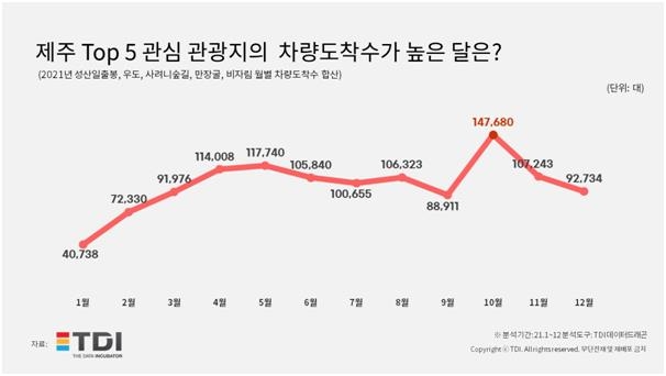 빅데이터 전문기업 TDI(티디아이)가 2021년 1∼12월 T맵과 제주관광공사의 빅데이터를 분석한 결과를 7일 발표했다.